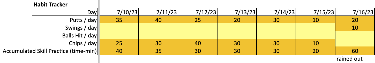 I’ll need to spend this week reflecting on the first 6 months of this Project and see where the greatest expected value of my time should go to if I’m to hope to shoot in the 80’s and eventually 70’s by the end of the year.