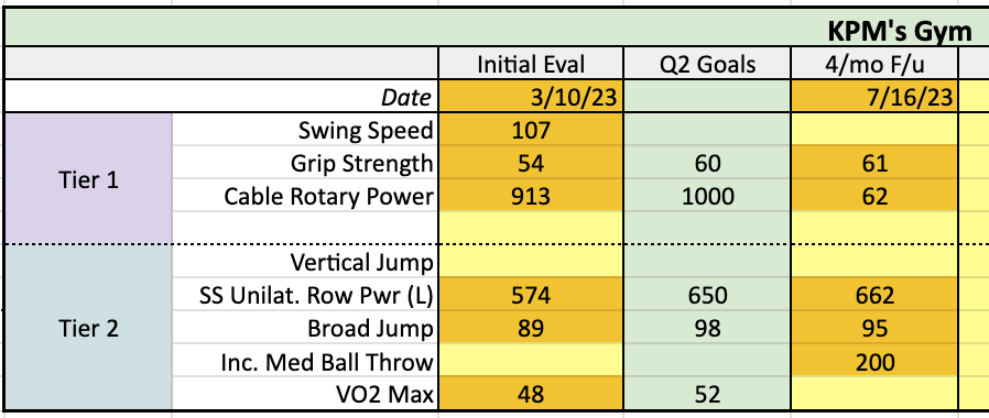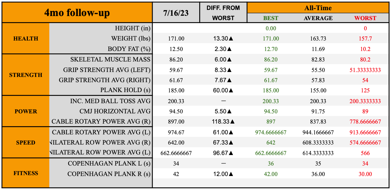 Some notes: I take 3 trials for each test and score it as the AVERAGE of those 3 per testing date. I do this because I’m looking for directional changes to my performance, not absolute changes.