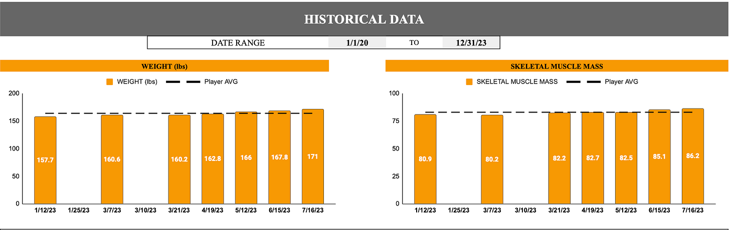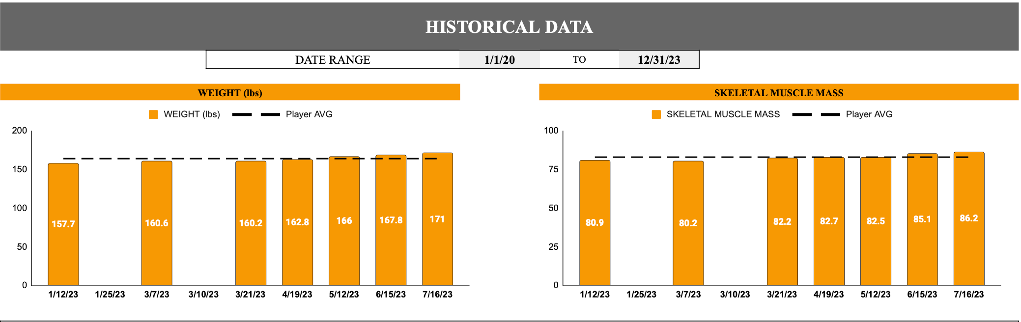 This second chart shows a month-by-month testing of my weight and muscle mass (as measured by an InBody machine.