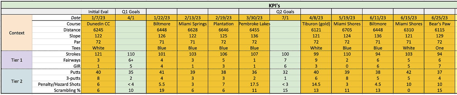 And finally this last chart shows what my pre-selected Key Performance Metrics were when I set them at the beginning of the year. Although I haven’t taken my golf-related-performance metrics again (I’ll have to do that soon), the improvements in every category is a great sign.